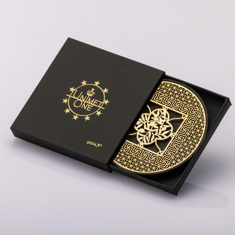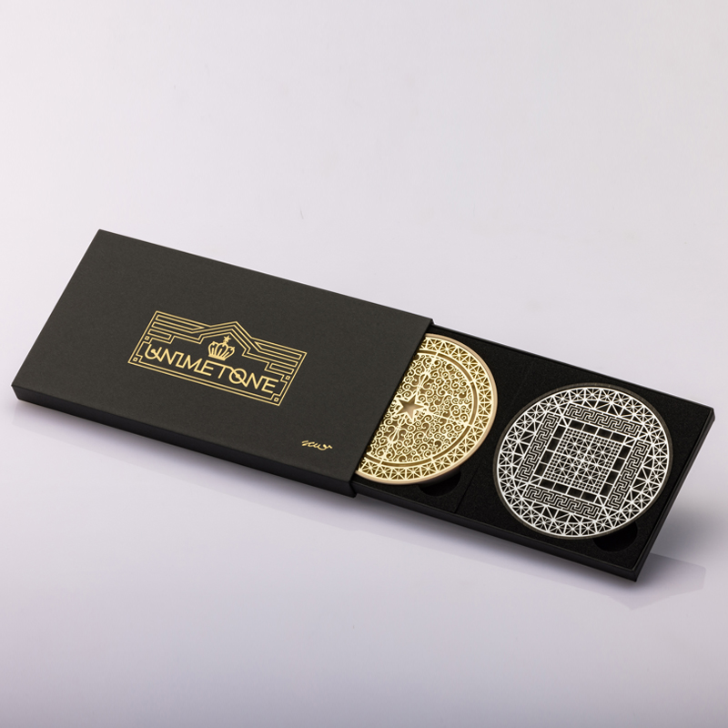 水戸岡 鋭治氏デザインによる柄を忠実に再現しステンレスを繊細にカッティングしたトップとアコヤ材の2層式のコースターにより、水滴が下に溜まり、テーブルを濡らす心配がありません。柄は【KUMIKO】【STAR】【PEACE】の3種類をご用意。ベースにはアコヤ材を使用しており、ホワイト・グレーからお選びいただけます。トップは下記4種類の仕上げがございます。